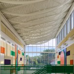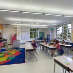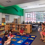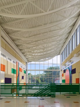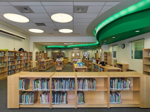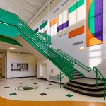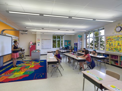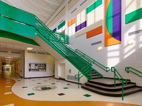 Clustered on both floors, the academic classrooms house students in kindergarten through fifth grade. Kindergarten and first grade are on the first level, which exits on-grade to both the front and rear of the building, with the remaining classrooms on the second level, organized on two corridors.