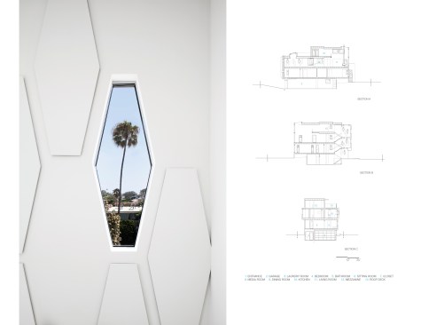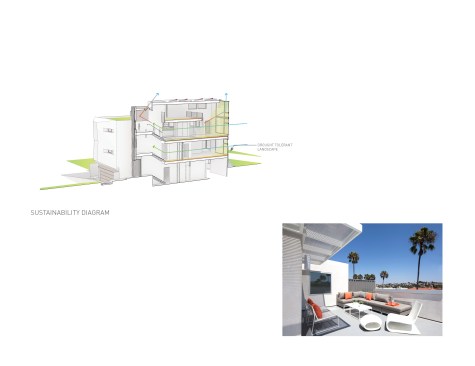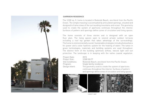 The 3,000 sq. ft. home is located in Redondo Beach, one block from the Pacific Ocean. The simple massing is accentuated by articulated openings, situated and designed to frame views of the surrounding mountains and ocean. The geometry used to create the system of apertures continues throughout the interior. Surfaces of pattern and openings define zones of circulation and living spaces. The home consists of three stories and is designed with an open floor plan. The living spaces open to several private outdoor terraces including a roof top garden that takes advantage of the surroundings.The home is environmentally sound. Sustainable strategies include photovoltaics for power and a solar hydronic system for the heating of water. The latest in green technologies, materials and building systems are used throughout. The distinct form of the building optimizes airflow, natural light and sun protection. The landscape is in keeping with the native coastal vegetation.