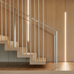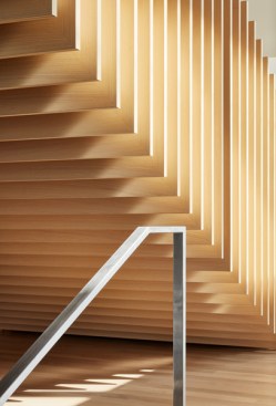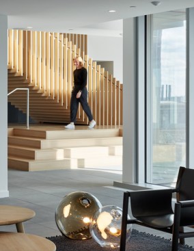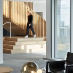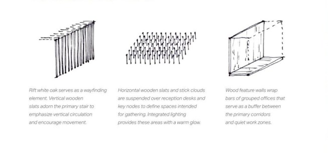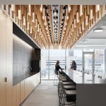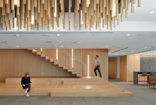 Throughout, the slatted wood motif and use of rift white oak surfaces tie the design together yet in distinct ways. For instance, the reception desks are clad in wood and sit under slatted wood acoustic ceilings, while in key areas intended for gathering — such as the shared café and lounge spaces — wood sticks are mounted vertically onto the ceiling along with vertical light bars to create a dynamic topography. Elsewhere, timber covers the landing at the base of the staircase, forms built-in storage, and wraps select wall areas.