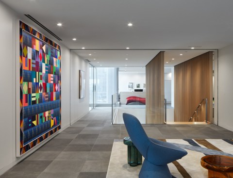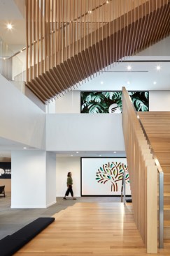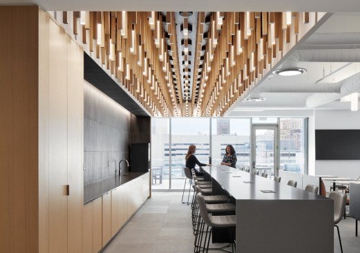 A consolidated office space for five distinct yet interrelated organizations of Pohlad Companies, Gateway22 encompasses nearly 71,000 square feet over three floors of the RBC Gateway Tower in Minneapolis with an aesthetically polished and energetic interior design aimed at attracting and supporting employees. Crafted by Snow Kreilich Architects, the workplace is unified by a dramatic three-story staircase volume defined by a slatted-wood balustrade that, on the upper flight, seemingly wraps the underside of the stair treads. From here, those traversing the steps are treated to panoramic views down Hennepin Avenue to the Mississippi River.