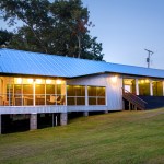 The owners asked that the camp to be durable and low-to-no maintenance. To fulfill this request, the exterior walls and roof are skinned in durable galvalume v-crimp and corrugated metal while the floors are composite lumber decking, recycled vinyl flooring, and tile for easy clean-up. The kitchen re-purposes an antique sink and uses sealed reclaimed cypress for shelves and counters, making a material connection to the large cypress tree visible from the kitchen window. Through the use of recyclable, recycled, or reclaimed materials, the goal was to create an occupancy that can last and resists construction waste.