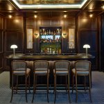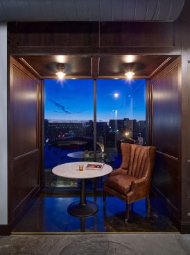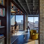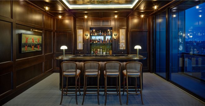 Dark wood paneling is initiated at the entrance and creates a continuous edge that divides the public and private spaces, and contrasts with the porosity of floor-to-ceiling glazing. Reclaimed brick partitions divide each volume. The palette is completed with inset caning, antique brass, and glossy tile. Furnishings introduce tufted leather, plush velvet, and woven rugs to optimize comfort. The composition of natural materials recalls the nostalgia of decade’s past, while looking confidently toward the future.