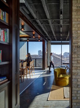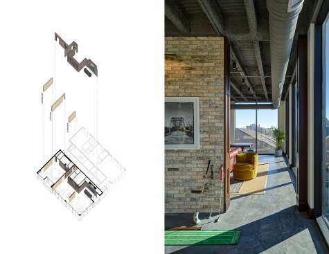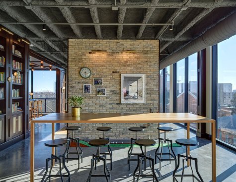 Situated at the top of a 5-story urban infill, this 2,100 SF office space provides refuge and inspiration within this small, historic commercial neighborhood. Departing from conventional office amenities, the suite is designed to promote invention and collaboration among a dynamic group of interdisciplinary entrepreneurs.