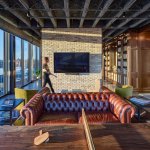 The office is divided into three equal-sized programmatic zones which comprises half of the building’s top floor. The interior theatrically inserts materials and furnishings into the concrete and glass volume. The juxtaposition of traditional with modern, through a variety of materials and forms, creates a unique and relaxed atmosphere.