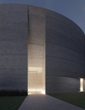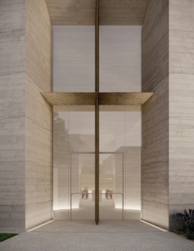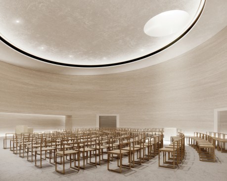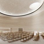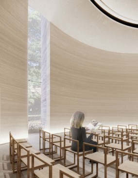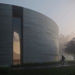 Trahan added, “Much of the design concept was developed during the height of the COVID-19 pandemic, and experimentations in poured concrete—prototypes of concrete-filled balloons were scorched, subject to various degrees of saturation, and punctured—were conducted in the backyards of the project team. The renderings reveal the impact of that research; the chapel will be hewed of variegated light-grey concrete striated by the formwork and will transition to a softer natural clay plaster at the interior. The process of concrete design and making is beautiful due to the unpredictability of the pour and the planar quality of the formwork. It is similar to a cylinder of geological formation, almost extruded from the earth, and we have exposed the layers below. It will age and patina as a canvas of the Louisiana environment.”