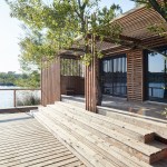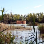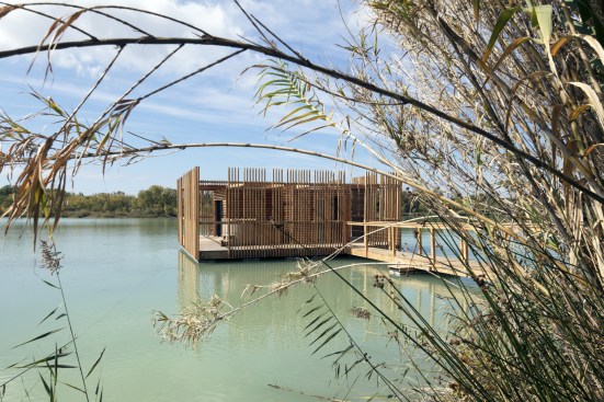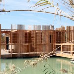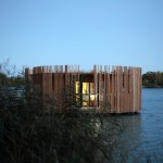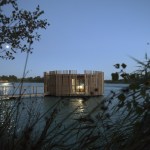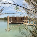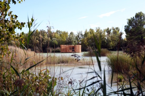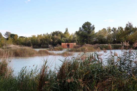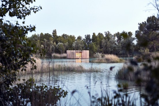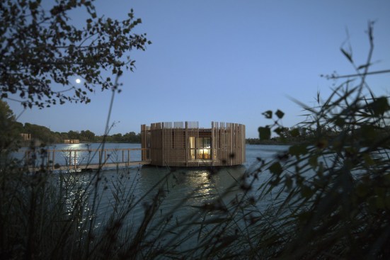 The Eco-hotel is located in a fishing reserve in Avignon, France. The 14 suites evoke primitive buildings on the shore of the lake; floating on the water like rafts or on pilots like palafittes. The architectural work perfectly matches with the lacustrine tubes from which it resumes and rationalizes the elegant vertical thrust. The different densities of the vertical wooden screens around the hut guarantees the privacy of its customers as well as repairing them from the sun and the wind.