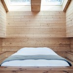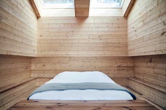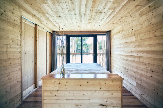 The change of the seasons and the hours of the day constantly transform the presence and the dynamics of the hut with the landscape. With leaf trees, the architecture integrates with the landscape in a perfect camouflage. In winter instead, with the earth and the lake gathered under a blanket of snow, the vertical lines of the battens are reflected on the water. During the day, the experience inside the suite is a play of light and shadow with the sun filtering through the screening, projecting motifs always moving on the floor.