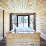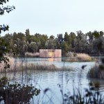 Random gaps provide abstract images of vegetation, lake and sky. After sunset the effect is reversed, immersed in darkness and illuminated only by the moon, the hut evokes a lantern, radiating the internal golden light between the wooden slats. In order to simplify the unforeseen in a remote site, the project was largely prefabricated in a wood workshop. The components were numbered, dismantled and rebuilt on site in three months. Prefabrication reduced production costs and on-site costs during installation, impacting the landscape as little as possible.