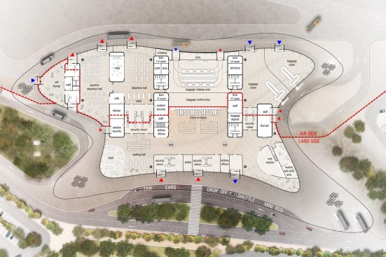 Studio Fuksas also designed the circulation system of the airport area: a one-way ring road, which distributes car and bus flows through the short and long-term parking entrances; the dedicated drop-off zones in front of the main entrance and the bus parking areas. Logistical system are directed to the west side of the terminal, away from the view of passengers.