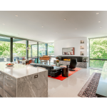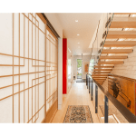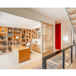 The interior of the homes was custom designed on each side, with primary spaces on the second and third floors and tertiary spaces on the first floor. By keeping primary living spaces above the street level, noise is mitigated in addition to providing an elevated view through large, floor-to-ceiling windows. A wine cellar, exercise room, and office expand the space into luxury living. Each side of the duplex has balconies at multiple levels, while the stone wall between them divides the space for privacy.