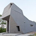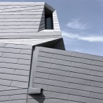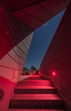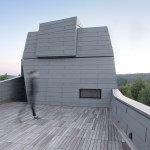 Gemma’s design rejects a traditional dome in favor of a synthesized architectural form that maximizes usable space and responds to the stark geographic context. Its continuously faceted shape reflects the surrounding landform, and terraced concrete platforms transition between the summit’s bedrock and the building foundation, knitting together natural and man-made landscapes. An unconventional pattern of lock-seamed zinc cladding mediates between the irregular site topography and the building’s geometry, reflecting Gemma’s orientation to both geological and celestial landmarks. Its dimension, color, and patina evoke a material relationship to the gray granite outcroppings, while its heat transfer capability facilitates sky observation by minimizing temperature differential distortion.