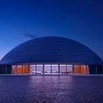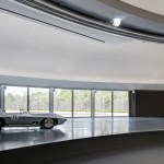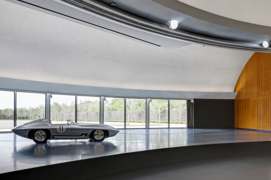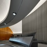 As car culture has changed, however, the demands of presentation have changed as well, and SmithGroupJJR has restored Saarinen’s masterpiece to pristine condition while making it a more dynamic display environment for contemporary cars. New multimedia equipment—embedded invisibly in the dome and circumferential soffit—make for a more stimulating and informative experience, while an adjacent auxiliary space has been adapted into a corporate meeting room with views of the show floor, so that while they’re deciding company strategy GM execs can look right out at the goods. They can even spotlight which cars they’re discussing: The pendant lighting system, which for years could only be adjusted by hand, is now controlled from a central console that not only directs light, but can also alter its color and bring up video and audio. In a suitably nostalgic touch, the console desk is a graceful modern swoosh, a tribute to the hood ornament of a classic 1940s Cadillac.