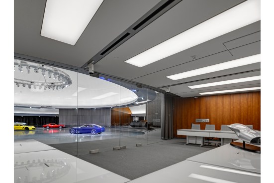 To engage GM’s management more directly with the products, an existing conference room adjacent to the auditorium floor has been transformed into a fully functional boardroom faced with ultra-clear glass. With proximity and unobstructed views, corporate decisions regarding product development can be rendered in real time.