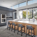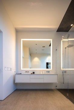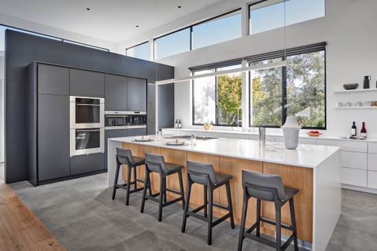 A renovation that turned into a new-build, the footprint for the project was dictated by an existing foundation with an 85-foot-wide flat-front facade. Working from this base, Maydan Architects expanded the footprint by 3,000 square feet through the addition of a basement. The clients desired stand-out exteriors, and while the city prefers facades to be unimposing and blend with the neighborhood, Maydan was able to please both parties with a design that broke up the mass of the building. By incorporating unique overhangs angled in different directions and adding horizontal elements to mitigate the perception of height, Maydan ensured that the home appears grand but still melds with the neighborhood. Ceramic tiles make up the concrete-look exterior, adding a touch of elegance and sheen.