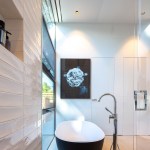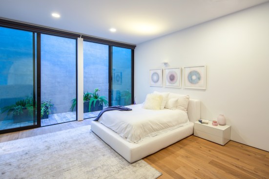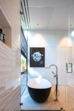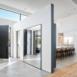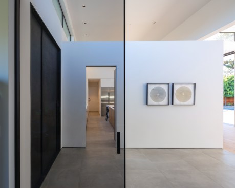 First and foremost an artist’s home, Geometric House was designed to elegantly frame and complement a curated selection of art pieces. The homeowner worked closely with Mary Maydan to develop a concept for the central painting that hangs above the sofa and provides a focal point for the entire living space. In a departure from the homeowner’s more figurative paintings, this piece was thoughtfully styled to blend in seamlessly with the ultra-modernist architecture.