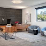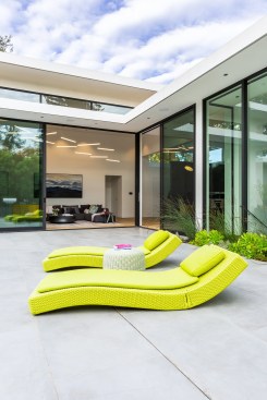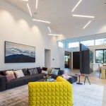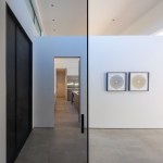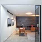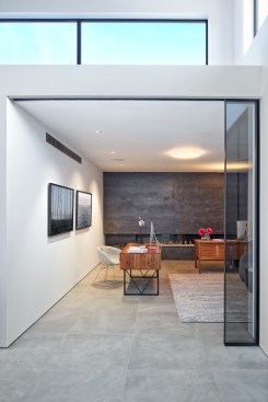 Maydan Architects focused on incorporating bespoke design elements that set the home apart and speak to the overarching “angles” theme. The oversize blackened zinc front pivot door was fabricated by Adam McNae. The door, weighing close to 1,000 pounds, is built from old steel plates sourced from construction yards that were restored and layered with plywood and rigid foam. A stunning 16’ plaster wall created by Alon Cohen of Coral Colours greets visitors upon entrance. Throughout the home, white oak hardwood floors and gray ceramic slabs of tile offer interesting contrast, while maintaining a seamless flow. The doors have concealed jambs and are installed in a way that creates just a thin reveal around the door leaf itself. The neutral interior color palette is livened with bold pops of color in the furniture and decor, including bright yellow, red, lime green, and purple.