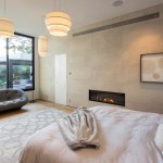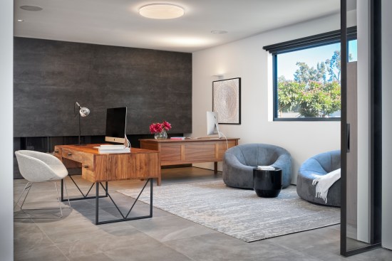A 16-foot ceiling in the great room creates a striking effect, while the lower-height dining room ceiling establishes a feeling of comfort and intimacy. By playing with the ceiling heights, Maydan was able to achieve both drama and coziness while adding visual interest. The connected kitchen was custom-designed by Maydan Architects, including the cabinetry and the island. The geometric theme is further supported by 3-D tiling in the bathrooms. In the office, a three-sided glass fireplace is surrounded by large slabs of Neolith ceramic tile that give the illusion of being supported by the fireplace glass. The basement houses a recreation room with a custom wine cellar, as well as a luxury media room with a stunning ceiling designed to mimic a star-filled night. Statement walls made of plaster and formwork, also by Cohen, create a concrete look in the recreation room.