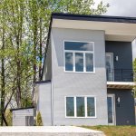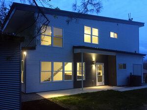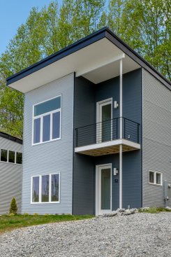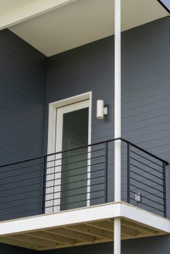 Low-maintenance exterior Galvalume siding is paired with ship-lap radiata pine at the entry porches and covered balconies on each of the three design variants —the Edgewood (featured), the Piedmont, and Inman— and each is painted a different color to give them a unique identity.