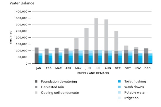 With the stream as inspiration, Jones says, the designers wanted to take things further. Preliminary calculations found significant sources of excess water in air-conditioning condensate, foundation dewatering, and rainwater. The firm created a separate system for capturing that as well—all water that, in a conventional design, would likewise be sent into the city’s storm drains.