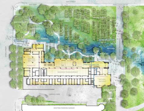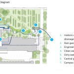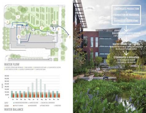 A conventional solution would have been to simply redirect the stream around the building and into the city’s storm drains. Instead, the firm created a system to collect the water and convey it, via pipes, to a 10,000-gallon clean-water cistern; overflow from the cistern feeds a fountain and a runnel alongside the building. That runnel then passes through a rain garden and into two adjacent wetlands. “The runnel is a representation of the historic stream that got buried over by decades of development,” Jones says.