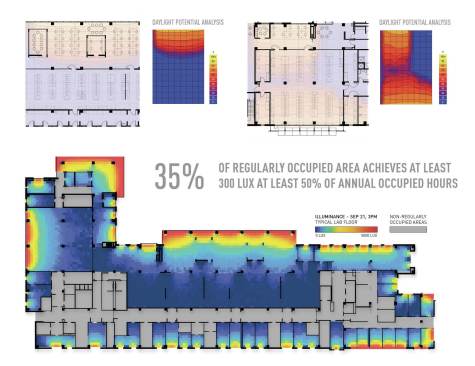 Percentage of floor area or percentage of occupant work stations achieving adequate light levels without the use of artificial lighting: 15 percent >300 lux at 3pm March 21