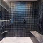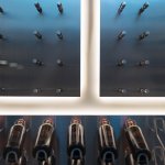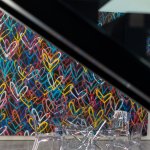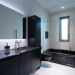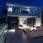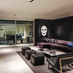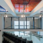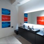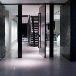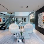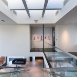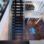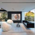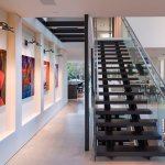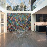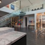 A step through the wide pivot front door of black steel from Neoporte Doors reveals the lively excitement of a modern live/work gallery space. Bright white, dramatic black, and colorful artworks are all illuminated by a central skylight (designed by Marc and Julie) of 9 combined Velux units atop a 15 ft. x 15 ft. atrium, which brings the light down three stories. Pale grey 32 x 32 inch (80cm) porcelain flooring tile made in Italy by Ergon, and sourced from Spec Ceramics at the Pacific Design Center flows smoothly from the exterior entryway throughout the living space. All the tile, marble, and stone in the house were installed by Mauro Puccia of Puccia Stone and Tile.