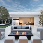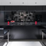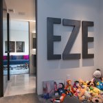 The downstairs atrium gallery pops with color from a wall-sized commissioned work by graffiti artist James Goldcrown. At one end of this below grade space is a cozy big-screen viewing area and bar with quartzite countertops in Brazil White from Stone Mart, in the opposite corner is a glass climate-controlled wine storage unit designed by Julie with pegs by Nek Rite. Then down the hall towards the back of the house is a weight room and guest bed and bath. The flooring throughout is 24 x 12 inch porcelain tile by Eleganza; Metalica Lite, in Steel. Outside, the patio is arranged for outdoor living with comfortable seating around a fireplace, along with a full outdoor kitchen and bar, also in quartzite, and the garage has been converted into a showroom for Julieās Harlen Collection.