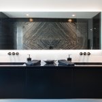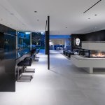 Directly to the left of the entry is the powder room and an elevator by Savaria, which services all three stories. Lighting design for the house is by Fox & Fox. Just past the glass-sided staircase follows a striking all-black kitchen with a 16 ft. x 4 ft. island of polished Absolute Black granite with waterfall edges, and opposite that are the dining area, fireplace, and conversation area flanked by Marcās signature vertical ribbon windows. A long galley of Italian kitchen storage cabinets by Ernestomeda sourced from Brownlow + Chen, plus a kitchen desk and chair concealed behind the entry art wall complete the space. Julie designed the kitchen backsplash, which is made up of individual metal tiles by Martyn Lawrence Bullard, purchased through Ann Sacks Tile. The white fireplace was also designed by Julie with help from Marc and Mauro Puccia ā and finding the right quartzite stone for its top and surround took many hours of determined hunting in various marble yards. The use of black granite for the kitchen countertops is repeated in the design of the dining table.