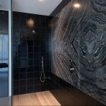 Upstairs at the front of the house is the combined childās bedroom and playroom, with a large picture window facing the street. The walkway flooring between the childās wing and the parentās suite is made of glass, which allows light and views, and adds an exciting, playful touch. This hall also accommodates an office workspace alcove. The master/mistress bath features a black and white Rorschach-like expanse of Kenya Black marble (from Antolini in Italy, through Stone Source) behind the tub and shower. The master suite also opens onto a terrace that overlooks the patio seating area and yard.