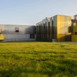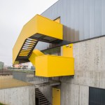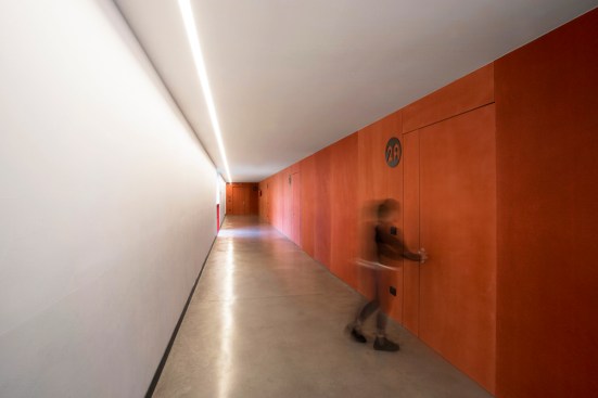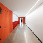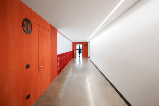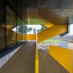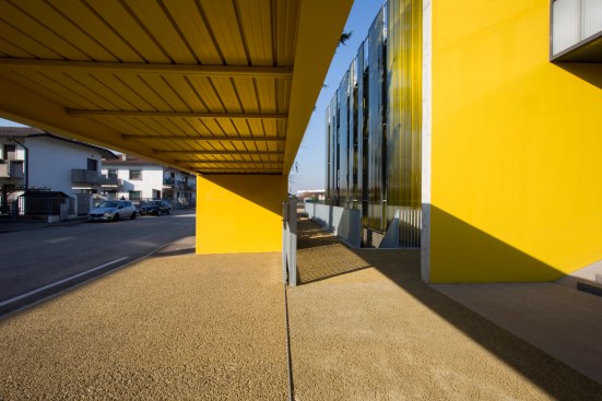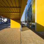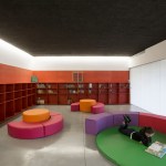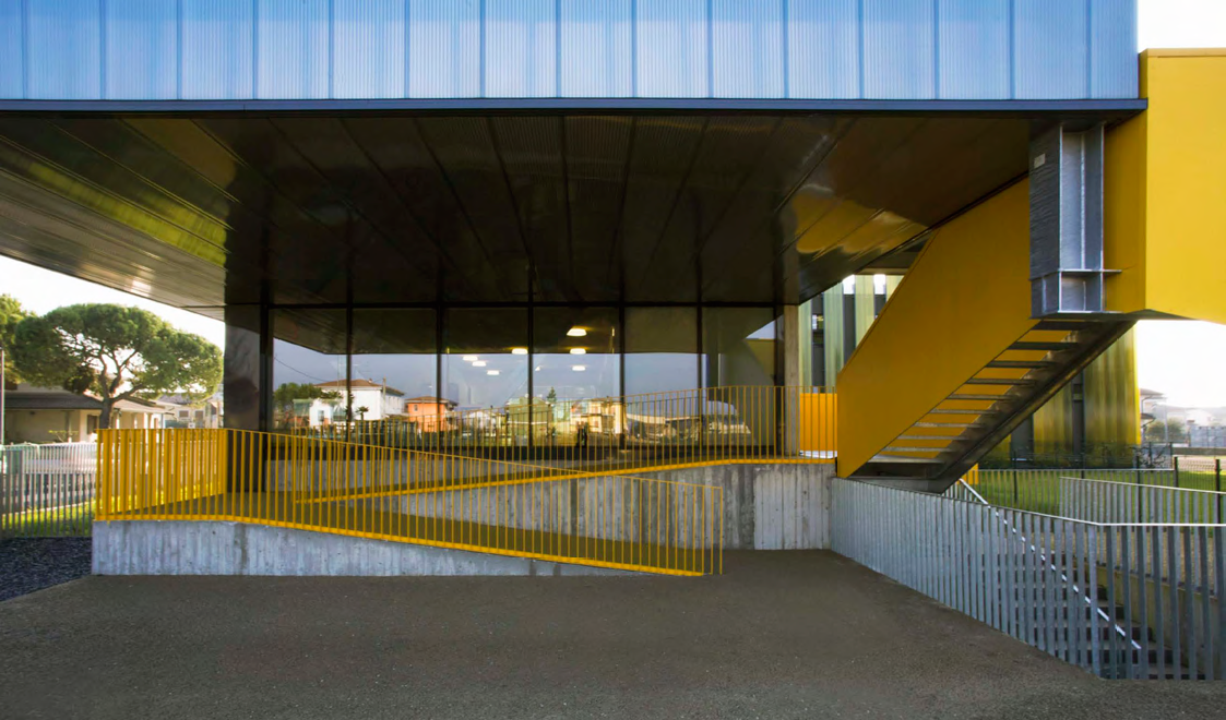 The inside of the building is dominated by colours by the use of a specific material called “valchromat” (a mix of wood fibers with resin, paste coloured and available in the colours of the natural oxide) to develop a real chromatic identity path for the small users of the building.