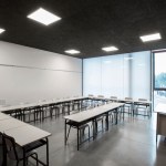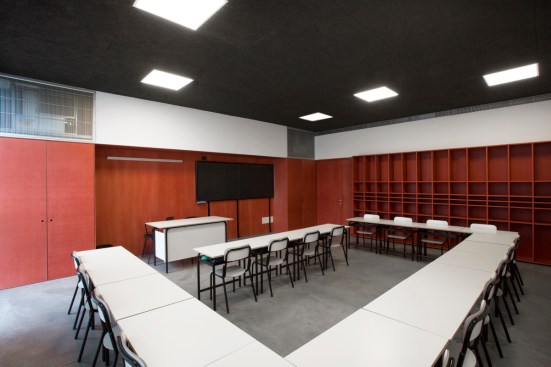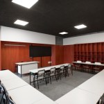 Thanks to its adaptability and its high technical performance, this material is used indistinctly as a wall cladding, and to create furniture and doors in particular in the classrooms and library that presents a fitted wall.