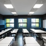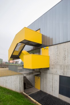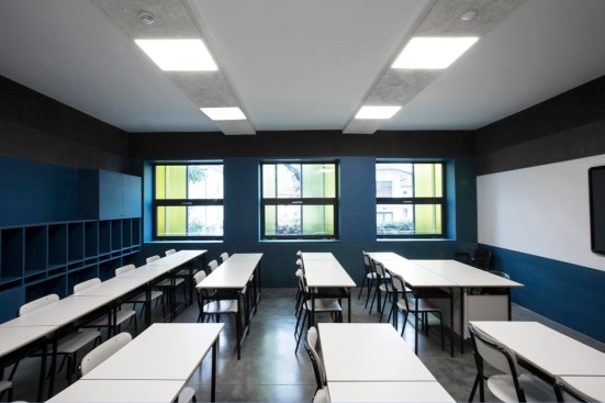 The upper floor facade is fully coated with polycarbonate with a strong insulation coefficient, with gray tones to the outside and white to the inside. In this way light coming inside the classroom is not modified in its colour by the exterior colour of the facade. The classrooms thus have an entire wall producing natural diffused light.