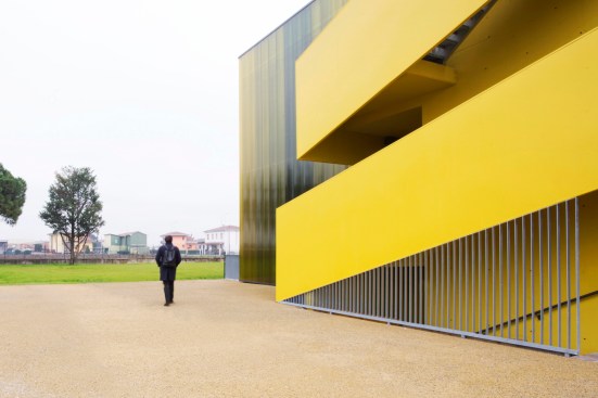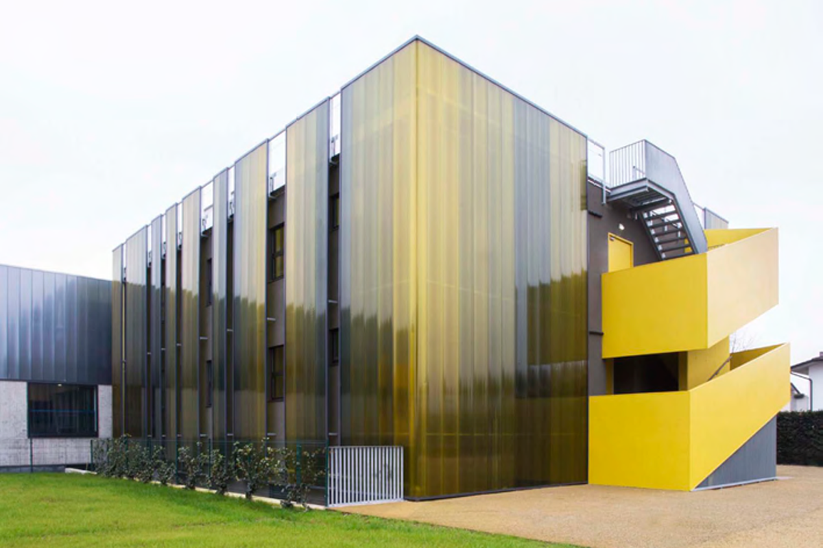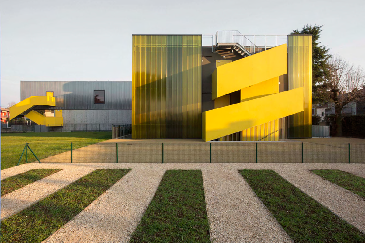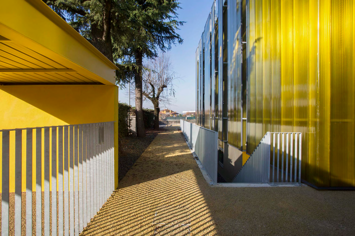The different yellow tones of the polycarbonate reflects the colours of the garden and define a changing aesthetic, sensible to the different hours of the day and the different seasons.