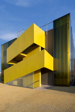 The gap between outside polycarbonate and inside glass facades is ventilated in the bottom by a grid and in the top by motorized windows to improve the thermal behaviour of the building.