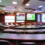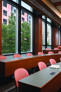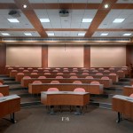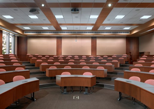 After completing a comprehensive plan to improve and expand the Law School while staying within their existing space, the first project undertaken was the complete renovation of the school’s primary lecture halls. The four rooms, dating to the 1960s, were each capable of fitting 100 students, but their configuration which put professors in a corner of the room was inflexible and left professors feeling distant from students. VMA reconfigured the rooms in a horseshoe configuration to better support the school’s Socratic method of teaching and maximize interaction between students and faculty. The new seating tiers were designed to provide clear sightlines and wheelchair accessibility, without the mess and noise of removing any of the original concrete seating tiers. A variety of lighting options, careful acoustical treatment, and extensive AV technology were added to the room to support a variety of teaching methods and special events in what became the school’s preferred teaching environment.