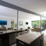 In negotiating the imposed location for the house, an inverted orientation emerged, turning away from the heavily trafficked street and towards the lush hillside and creek found within the property. The house was conceived as the interlocking of two concepts of dwelling, consisting of an opaque volume, screening the residents from the noise and intensity of Laurel Canyon Boulevard and a thin scrim of metal and glass, supporting a porous relationship between the interior spaces and the nature beyond. The house consists of a series of contiguous living spaces that open to the terrace, expanding the interior deep into the site and over the creek.