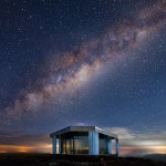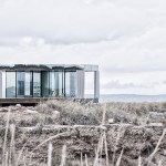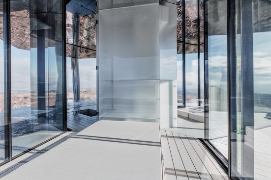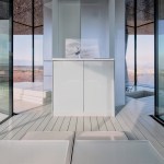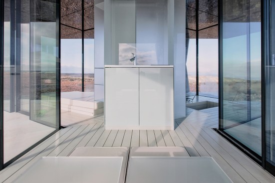 The unit uses the vertical glazing panels of the envelope as structural walls, resisting the desert’s high-speed winds and supporting the timber stressed skin roof and deck. The glass thermally efficient envelope is constructed of triple glazing walls that, due to use of almost invisible coatings, protects the interior from the sun.