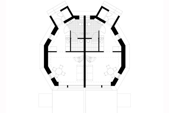 Each house contains two accommodation units of 40 m2 . Facilities include double height living area, balcony floor with glass roof, kitchen, own sauna and outdoor hot tub terrace.