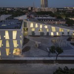 If there’s one thing that the new Glassell School of Art has in common with its predecessor, it’s that it glows in the dark. The L-shaped building, a branch of the Museum of Fine Arts in Houston, is the work of New York–based Steven Holl Architects (SHA), and its dramatic exterior is defined by trapezoidal precast concrete panels and equally large panes of translucent insulated glass. At night, those large windows turn the building into an immense lantern, suggesting the artistic life within.