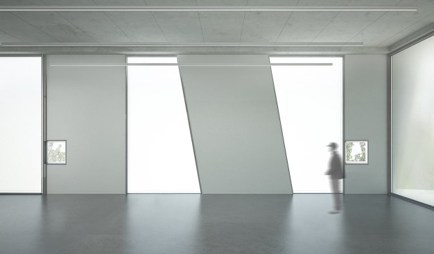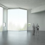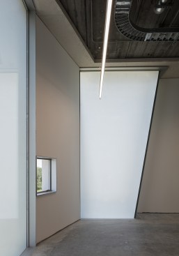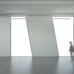 On one side of the lobby is a gallery and café space; on the other, a 75-seat auditorium dressed in warm wood and green fabric, the only space in the building that is not either white or light gray. At the top of the stairs, on the second level, is the school’s principal gallery space, a rectangular room illuminated by the broad trapezoidal windows, which can be closed off to create a darkened space for video works and other installations that are allergic to light.