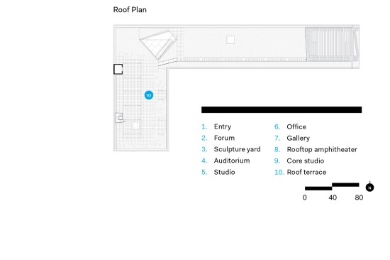 Members of the public, too, are welcome to make use of the building at their own discretion. At the base of the sloping wing is an amphitheater of ipe wood benches that can be used for performances or just to sit and contemplate. A path up the angled green roof leads to a terraced pavilion with views across Houston.