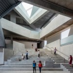 The main entry opens to a cascade of levels at the forum shaping an informal learning space directly opening to a 75 seat auditorium.