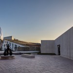 The inclined plane of the roof shapes an amphitheater and a public path to a rooftop sculpture garden overlooking the whole MFAH campus.