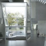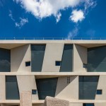The building’s almost relentless whiteness makes it a metaphorical blank slate from which students can conjure their own visions. Its heart are the studios themselves, 35 in all and of varying size, each filled with clean bright light. That light streams in from the broad trapezoidal glass panes, which are supplemented by 3-foot-square operable windows notched into the concrete panels. From the exterior, these small cutout windows give the concrete panels almost human form, like abstracted Easter Island heads.