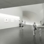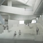 But the most dramatic space of the entire composition might just be beneath that amphitheater, under the wedge where the sloping plane hits the ground. This isn’t wasted space, as one might imagine. Instead, it is the top of a dramatic three-story atrium that will link the underground garage to Holl’s new museum building—which is currently under construction and is expected to be complete in 2020—via an umbilical tunnel.