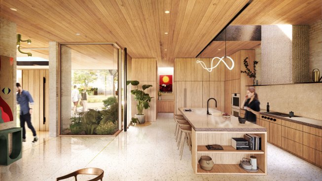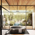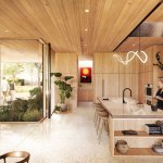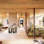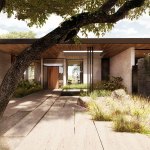 Existing 8’ plate height at street level is raised to 11’. An expansive flat roof with two oculi replaces low-slope hip roofs. One oculus carefully carves out to accommodate live oak limbs and the second allows for rainfall into a water feature alongside the main entry.