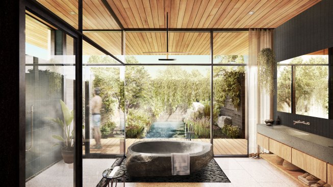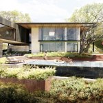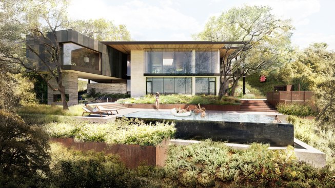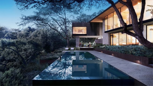 Site features include a generous front yard with mature live oaks and a dramatic cliff at the backyard’s western edge. To allow for seamless flow between kitchen, dining, and living, the dropped living room rises to become flush with street level. The family room functions as a pool cabana on axis with an infinity edge pool that extends over the cliff and optically into the greenbelt below. A gradual site drop allows for a walk-out basement.