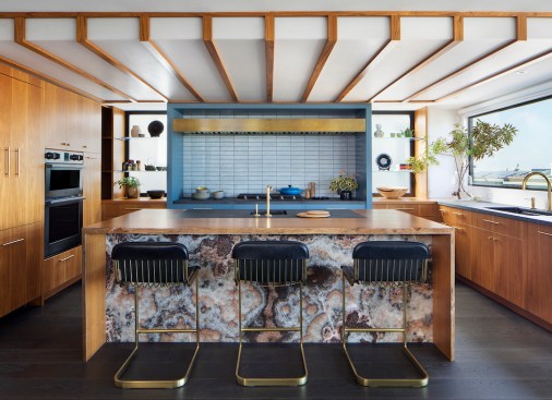 The second level was transformed into the owner’s quarters. One bedroom was converted into a sitting room for the primary suite, with a teak box separating the two that hide a walk-in closet. Another bedroom is used as an office, and the fourth bedroom was converted into a gym and guest room.