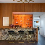 The first floor was gutted to create one large entertainment room. One side of the room features a raised platform for performance that doubles as a cozy inglenook. It is anchored by a folded brass sheet chimney breast and clad in shou sugi ban. Opposite, is an open kitchen featuring illuminated ceiling, live teak edge counters, and complex marble island face. A full-height wine cabinet distinguishes the dining area, cleverly hiding the original stairs. The lounge includes a vibrantly backlit wet bar. A folding window wall opens this space to the zen entry garden where stairs ascend to a hillside guest house.