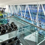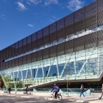 And that’s where the voyeurism comes in: The east-side truss is left completely visible behind the cable-supported glazing, a transparency that allows the lobbies to look down into the basketball and volleyball courts, and gives the double-height Strength and Conditioning Centre a strong presence from the street. This visual showcase theatrically fulfills the objective of promoting health and wellness on campus.